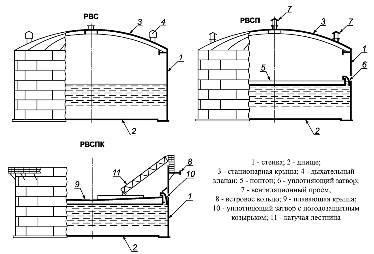 - резервуар вертикальный стальной с понтоном (РВСП) - используется для хранения легко воспламеняющихся жидкостей (спиртовых и нефтепродуктов);